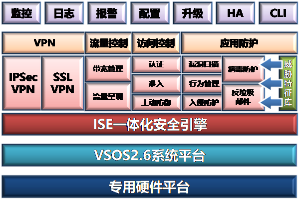 天清汉马USG防火墙采用启明星辰自主研发的专用安全操作系统VSOS,该系统面向网络吞吐和安全处理,采用基于组件的多平面架构,整个系统分为控制平面、数据平面、系统服务平面和硬件抽象平面,通过控制平面和数据平面的分离,不同于Linux,FreeBSD等通用操作系统追求均衡的方向,集中主要资源于网络吞吐和安全处理,使系统具有极强的实时性和网络吞吐能力。
