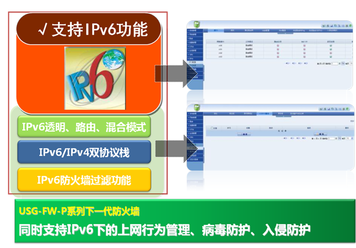 虽然IPv6在网络厂商应用较为广泛,但在安全厂商中,支持IPv6的网络安全产品(如防火墙、UTM、IPS等)还是较少,启明星辰天清汉马USG-FW防火墙支持IPv6功能包括:IPv6环境下的状态包过滤、静态路由、OSPF动态路由、FTP、ALG等基本安全控制,以及IPv6/v4 双协议栈功能;设备在同一信息安全网络中同时支持 IPv4 和IPv6协议的安全控制日渐得到关注。